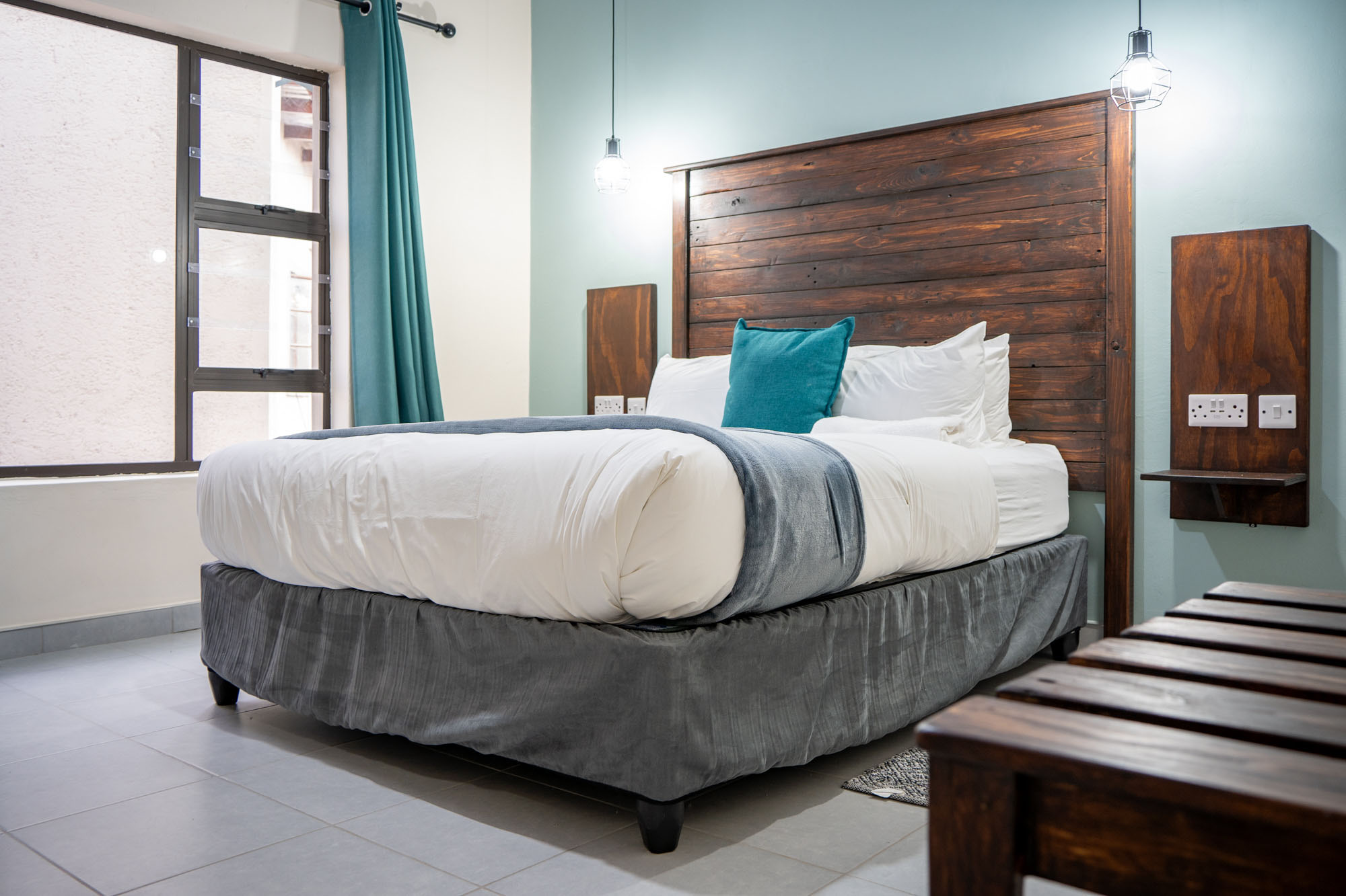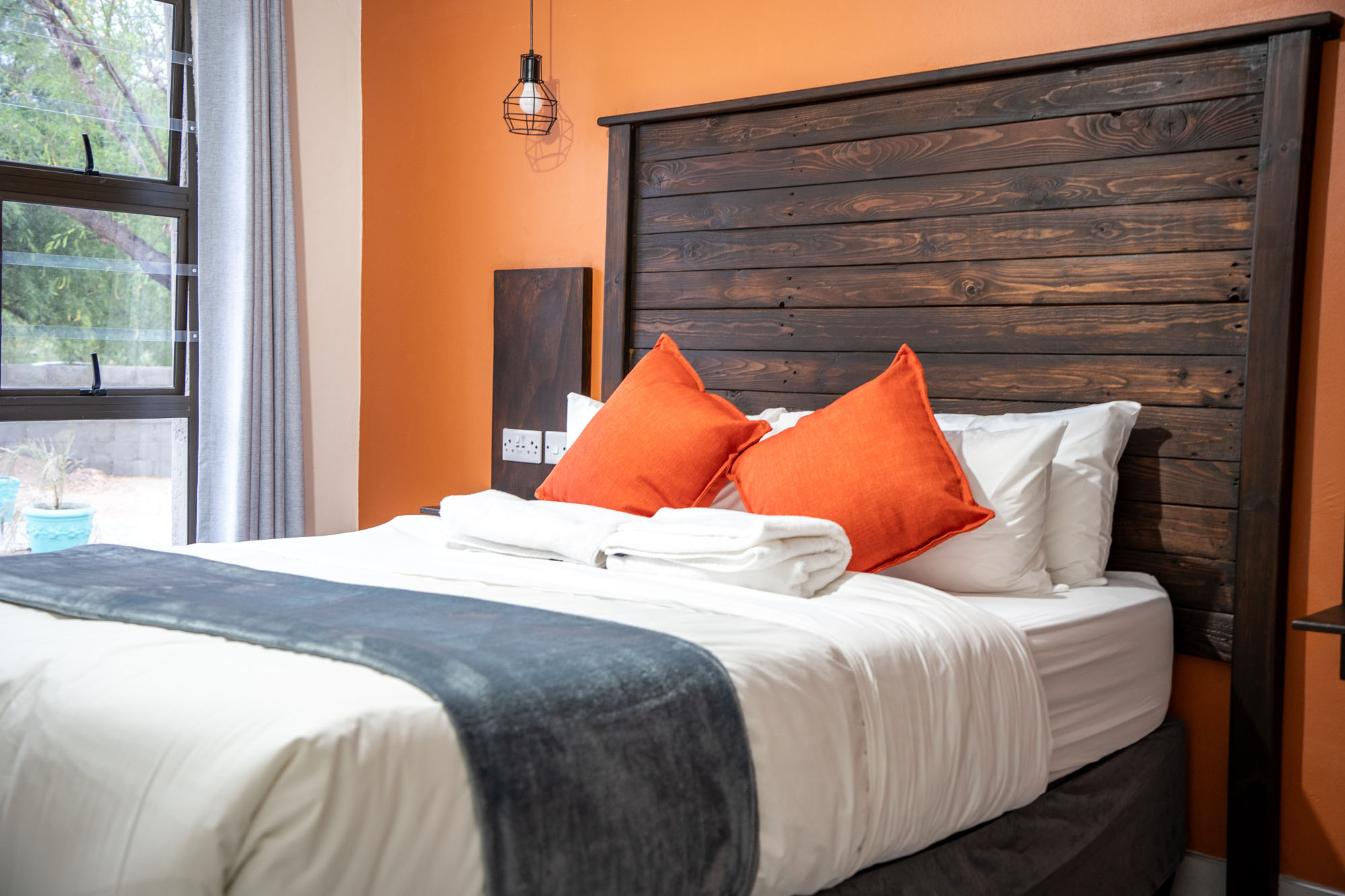 This is a one bedroom apartment with a queen-sized bed, open plan kitchenette, living area, and private bathroom for a relaxing stay in central Ghanzi.